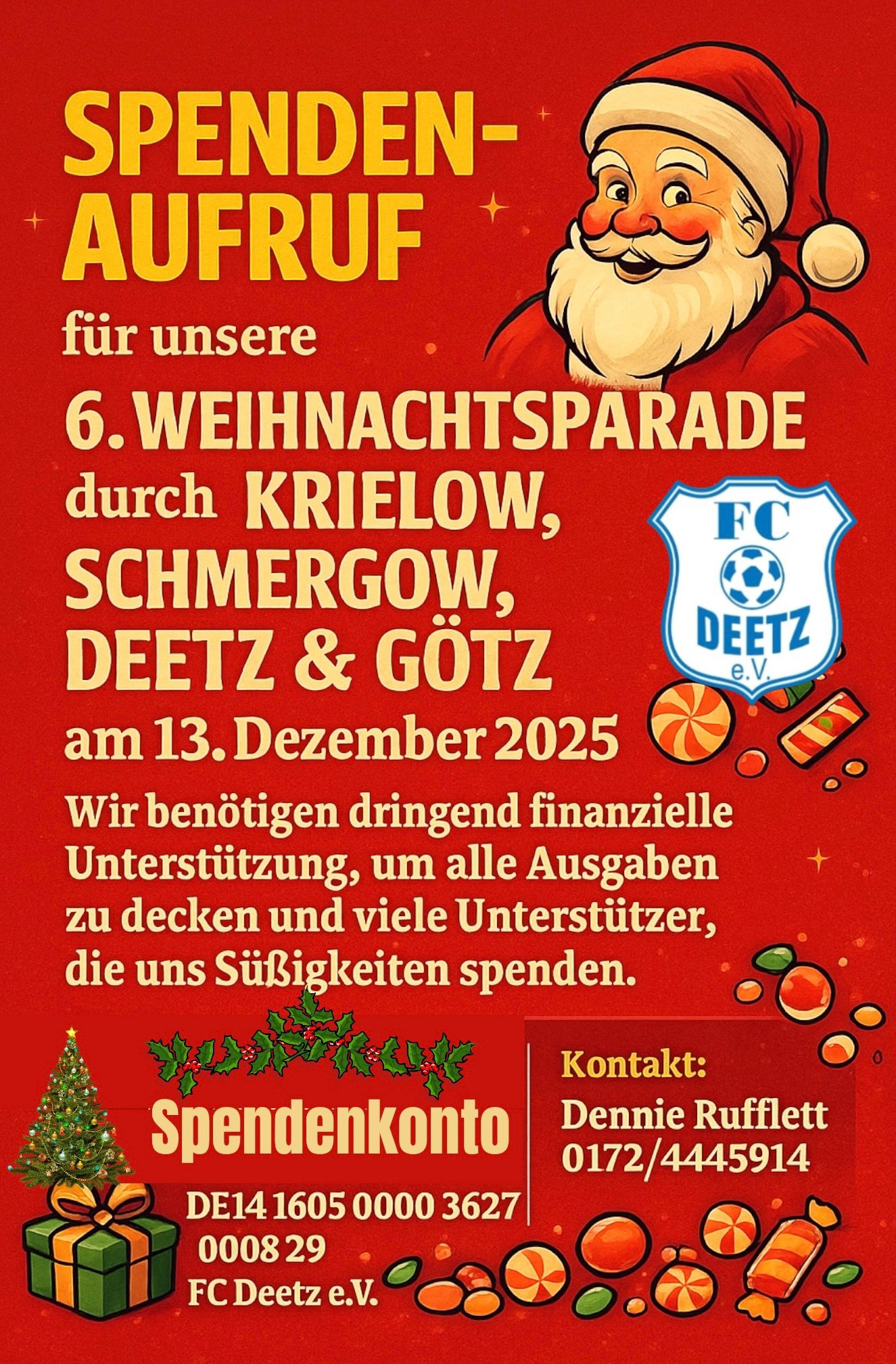Damit die Weihnachtsparade auch 2025 wieder ein unvergessliches Erlebnis wird, ruft der FC Deetz die Bevölkerung, Unternehmen und Unterstützer der Region zu dringender finanzieller Hilfe auf. Die Organisation dieser großen Gemeinschaftsaktion ist mit erheblichen Kosten verbunden von Technik, Beleuchtung, Feuerwerk und Musik über Transport bis hin zu den vielen kleinen Überraschungen für die Kinder entlang der Strecke.