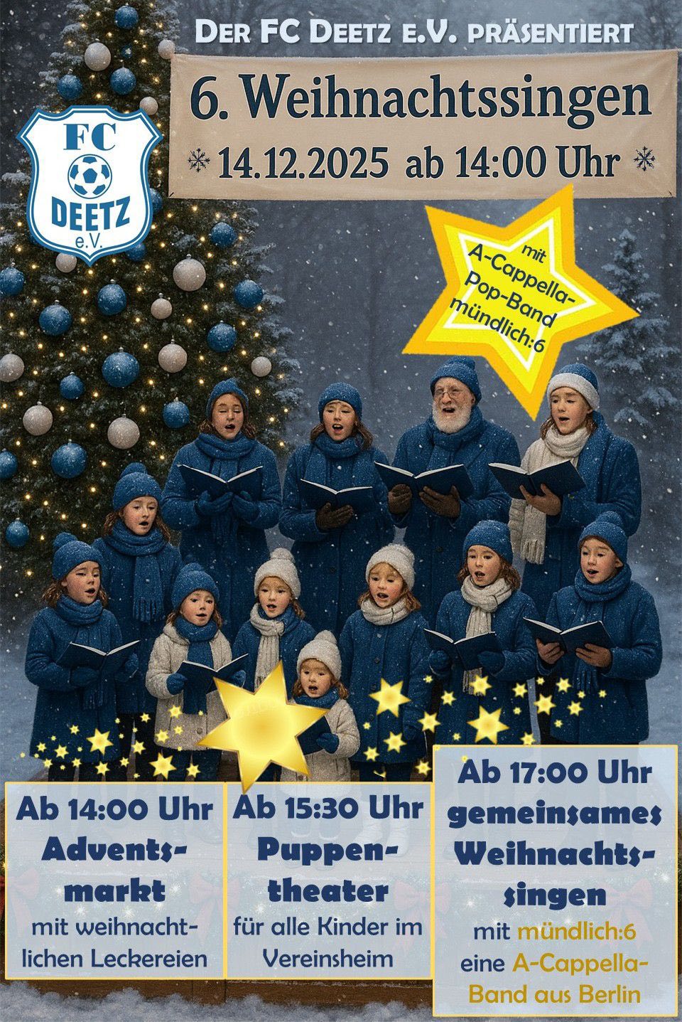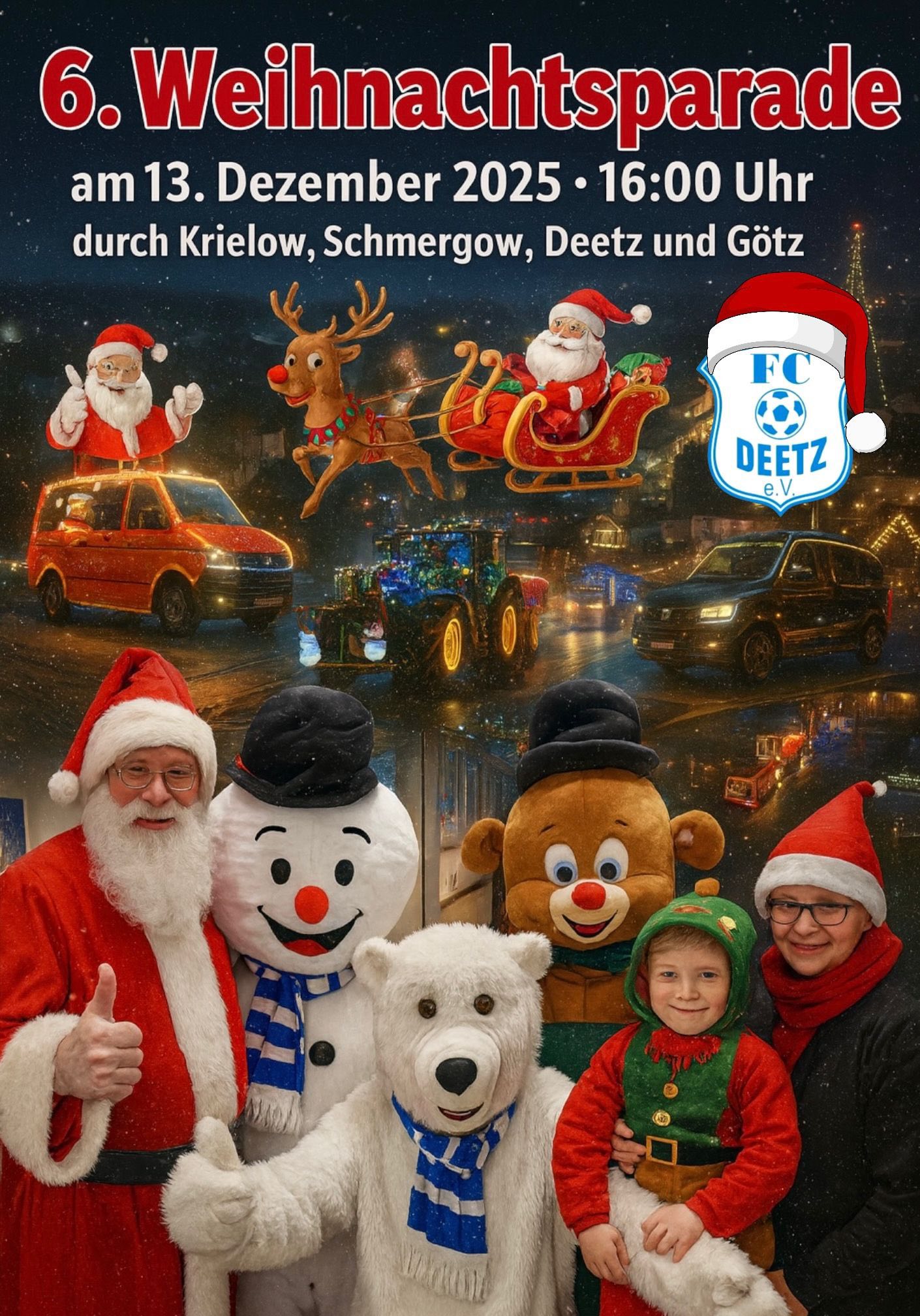 Traditionell und nun bereits zum sechsten Mal, wird der FC Deetz, gemeinsam mit vielen Partnern und Helfern, am 13.12.25 seine Weihnachtsparade durchführen. Dies wird wohl wieder das Highlight des 3. Adventswochenendes in und um Deetz werden. Das Weihnachtssingen am 14.12.25 wird den 3. Advent festlich ausklingen lassen.